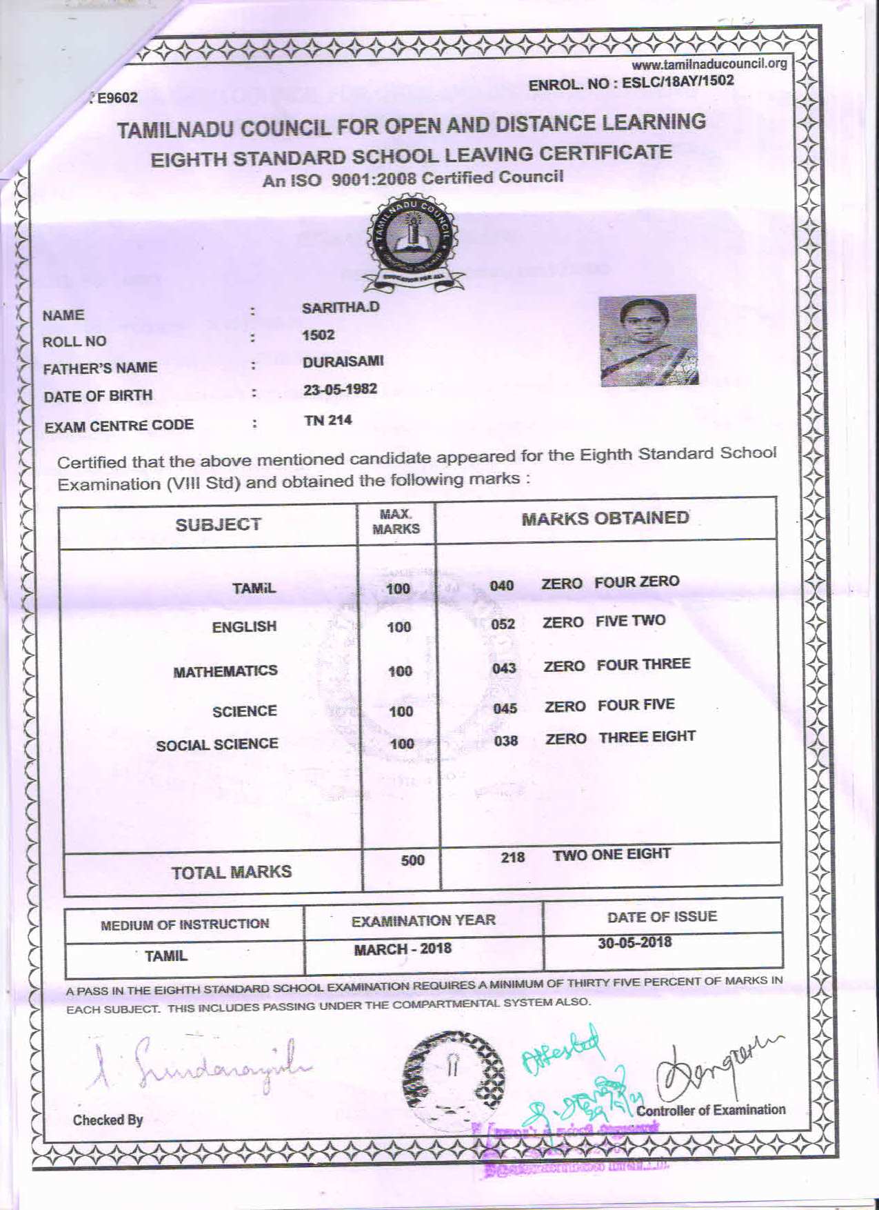 4. Tamilnadu Council student's mark sheet sent for verification from RTO-Sangagiri